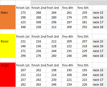 - Lorenzo harus cleansheet di 4 race terakhir tetapi Marquez harus tampil buruk, setidaknya selalu finish diurutan 6 hingga akhir musim.