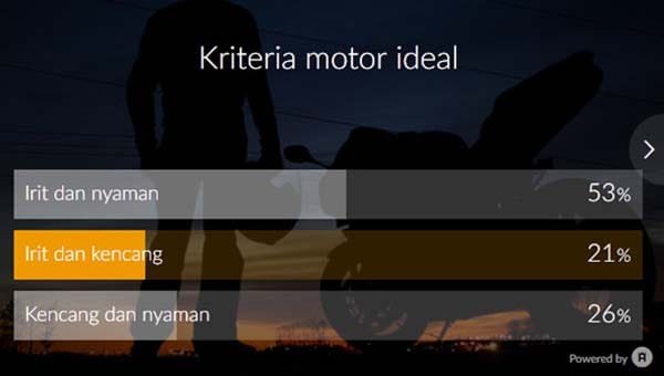 Yup benar, dari tiga kriteria yang diberikan yakni; Irit dan Nyaman, Irit dan Kencang serta Kencang dan Nyaman, responden yang terdiri dari 1.439 orang itu 53%-nya memilih motor dengan karakteristik Irit dan Nyaman.